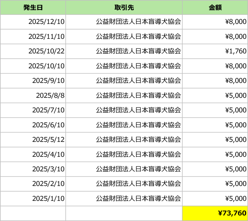 寄付金の合計は73,760円となりました。ぬこファクトリーは日本盲導犬協会の賛助会員なので定額で寄付活動を行っているのですが、途中ショップでカレンダーを購入したりしたり、途中で民間のとある農業に関する会費活動をやめて、日本盲導犬協会に加算したことなどもあって中途半端な金額となりました(笑)