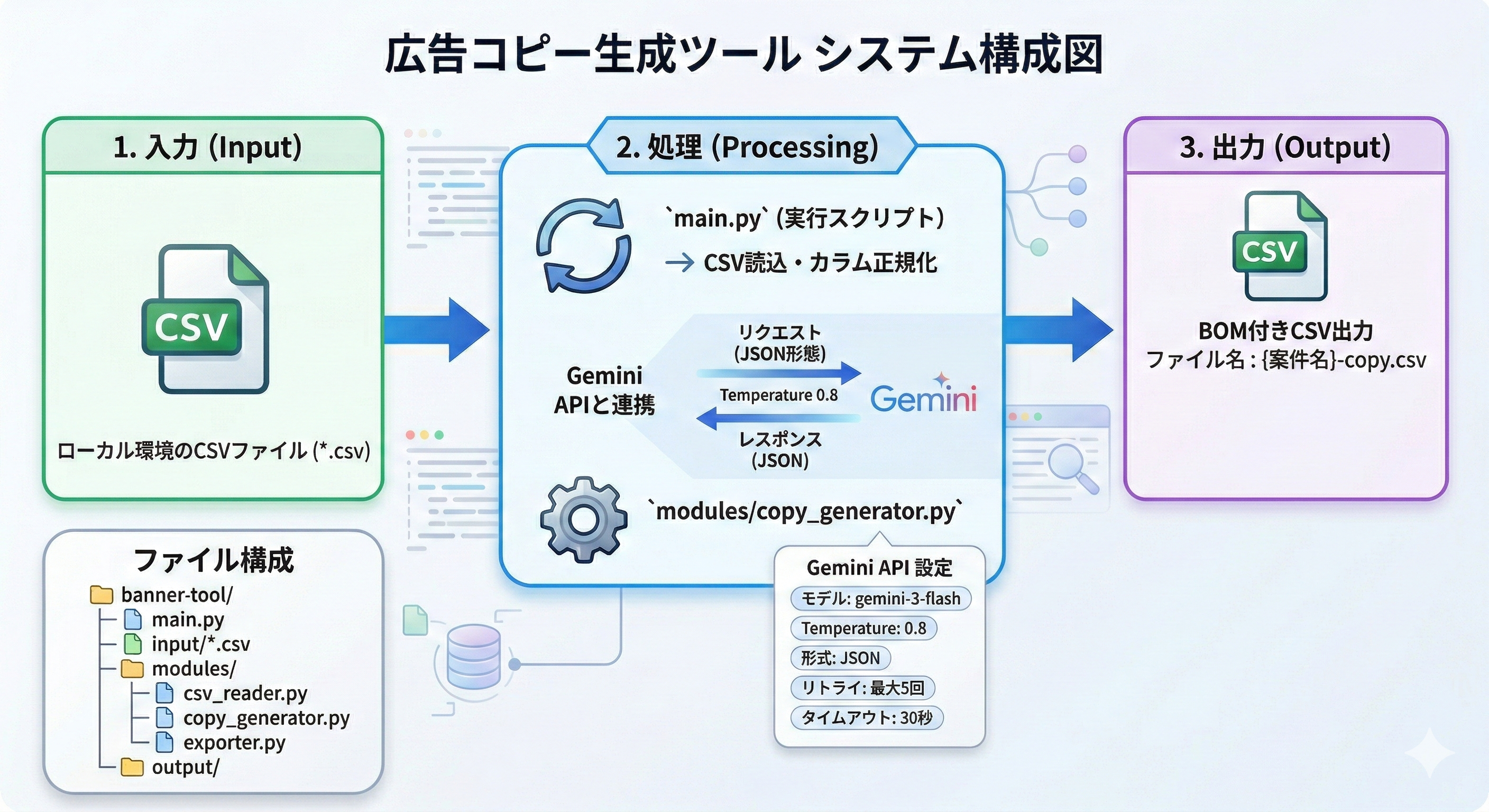 2つ目は、CSVファイルから各メディア向けの案件ごとの画像・見出し・説明文をAIが自動生成するシステムです。普段の広告運用業務を省力化するために作りました。